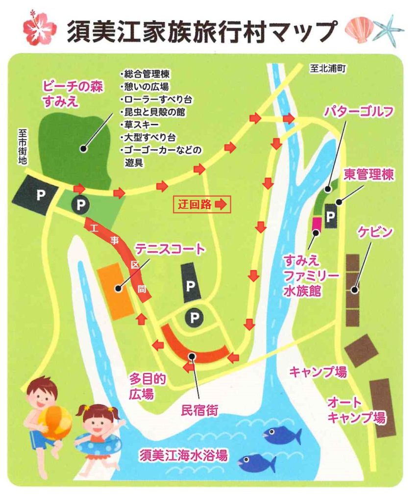 現在、サンビーチ須美江線の工事を実施しておりますが、9/24水、25木、26金は以下の区間において道路舗装が行われるため、車の通行が出来なくなります。上記期間中にテニスコートや多目的広場をご利用のお客様は、キャンプ場方面から入る迂回ルートがございますのでそちらをご利用頂きますようよろしくお願い致します。