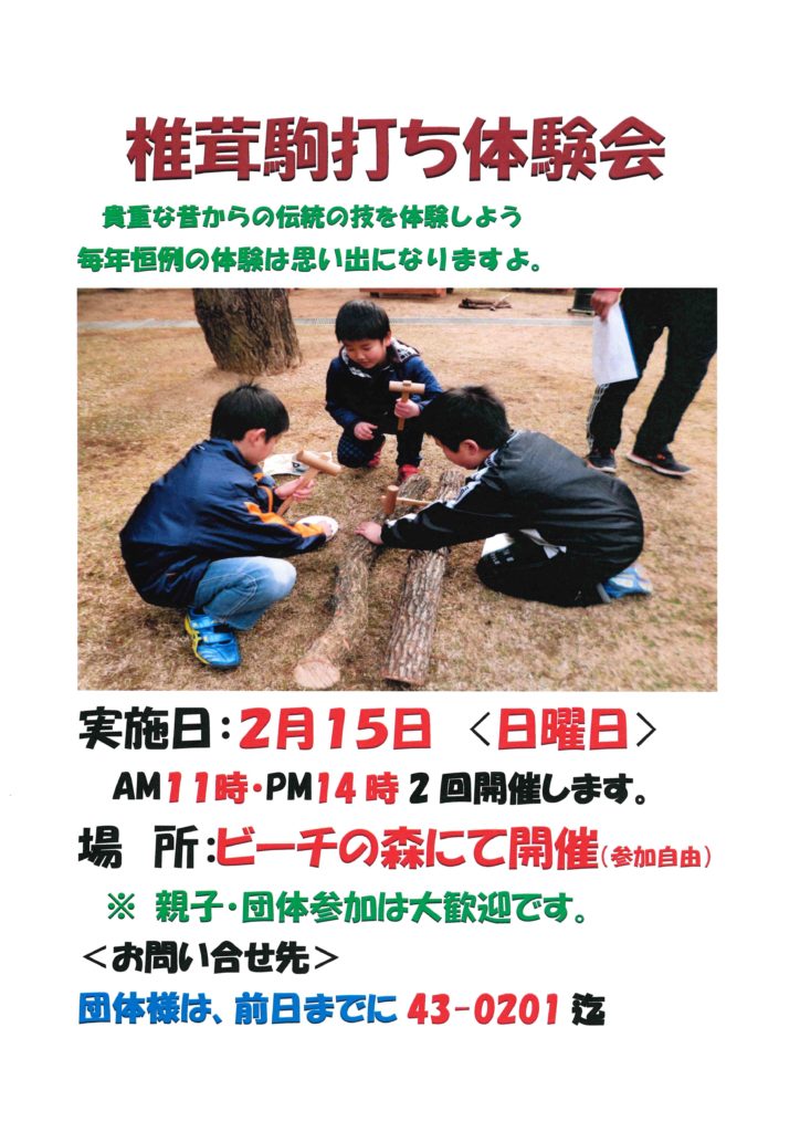 内 容:椎茸用の原木に駒を打ち込む昔からの伝統の技を体験しよう。初めての方もスタッフが優しく指導するので大丈夫です。