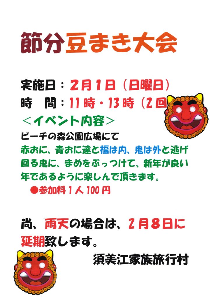 内 容:「福は内、鬼は外」と逃げ回る鬼に豆をぶつけて、新年が良い年であるように願いを込めて楽しんで頂きます。